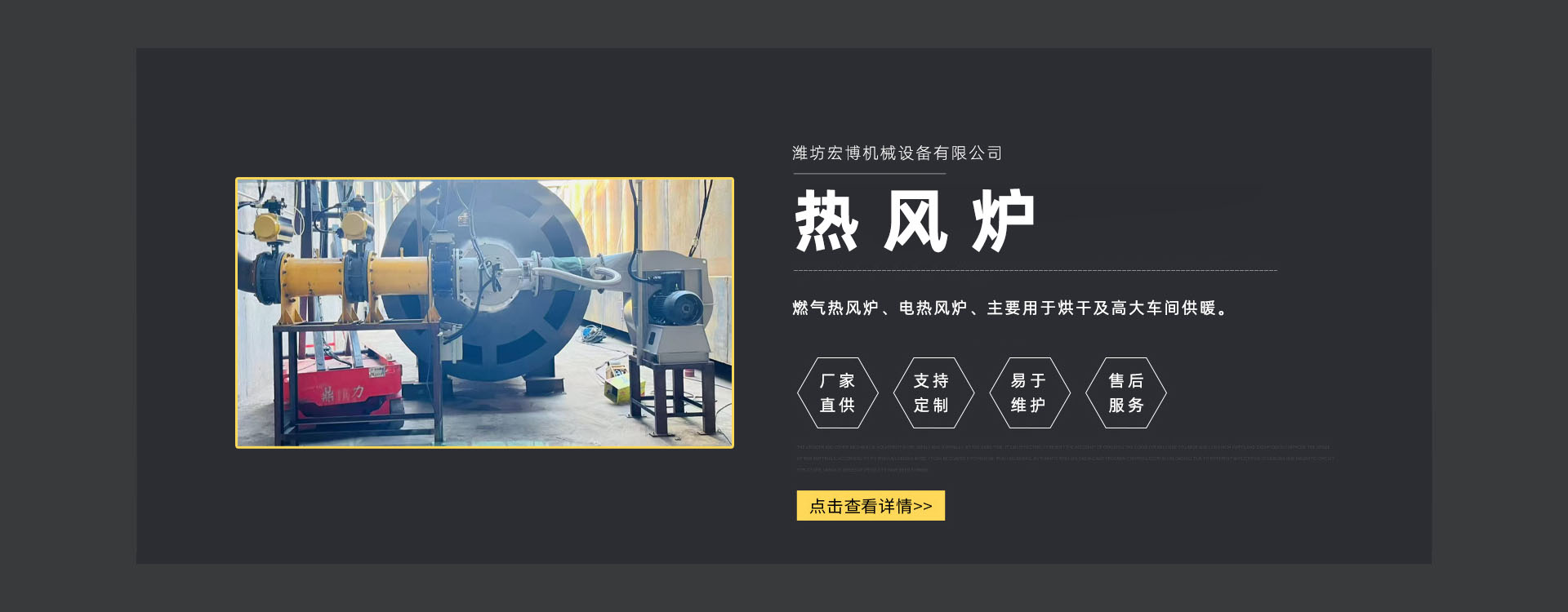 濰坊宏博機(jī)械設(shè)備有限公司是從事熱風(fēng)爐、烘干設(shè)備、供暖設(shè)備的研發(fā)(fā)、設(shè)計(jì)、制造和服務(wù)于一體的實(shí)體企業(yè)。長(zhǎng)期以來,企業(yè)以市場(chǎng)的發(fā)(fā)展和客戶的需求為導(dǎo)向,集多年的生產(chǎn)技術(shù)與經(jīng)驗(yàn)為一體,不斷開發(fā)(fā)和優(yōu)(yōu)良產(chǎn)品。
